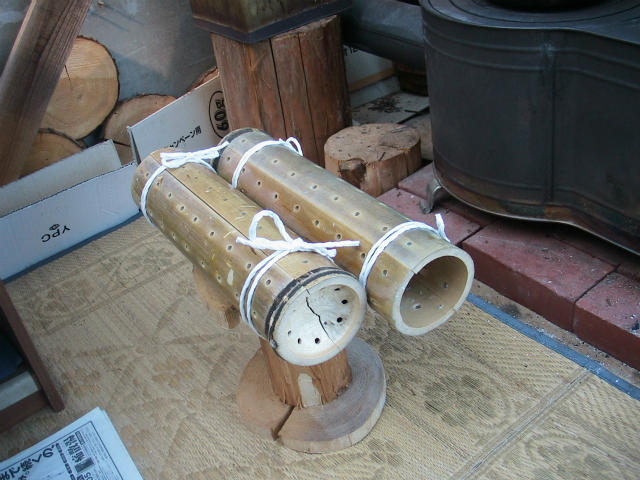 竹にドリルで小さい穴を沢山開けて、縦に二つ割りにしてあります。