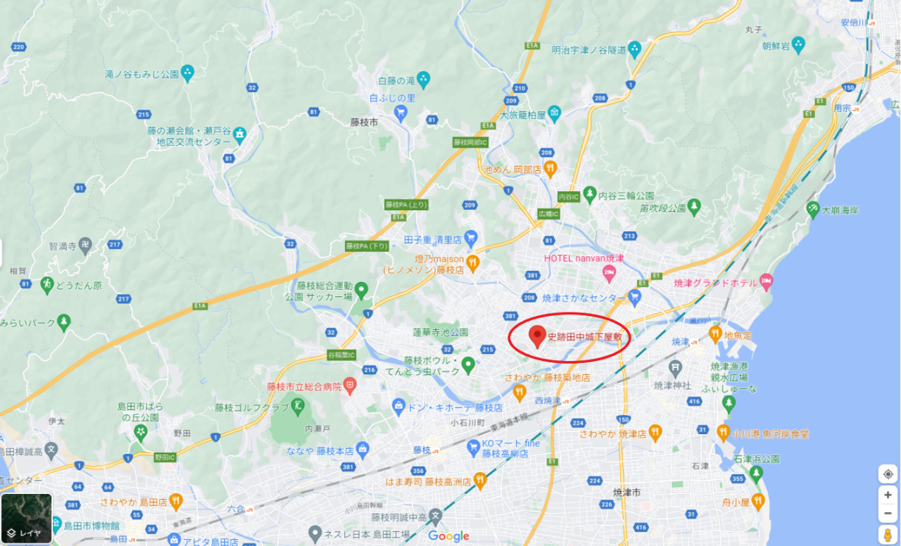 下に田中城の地図を出しておきます。所在地は藤枝市ですが、車だと東名焼津市IC