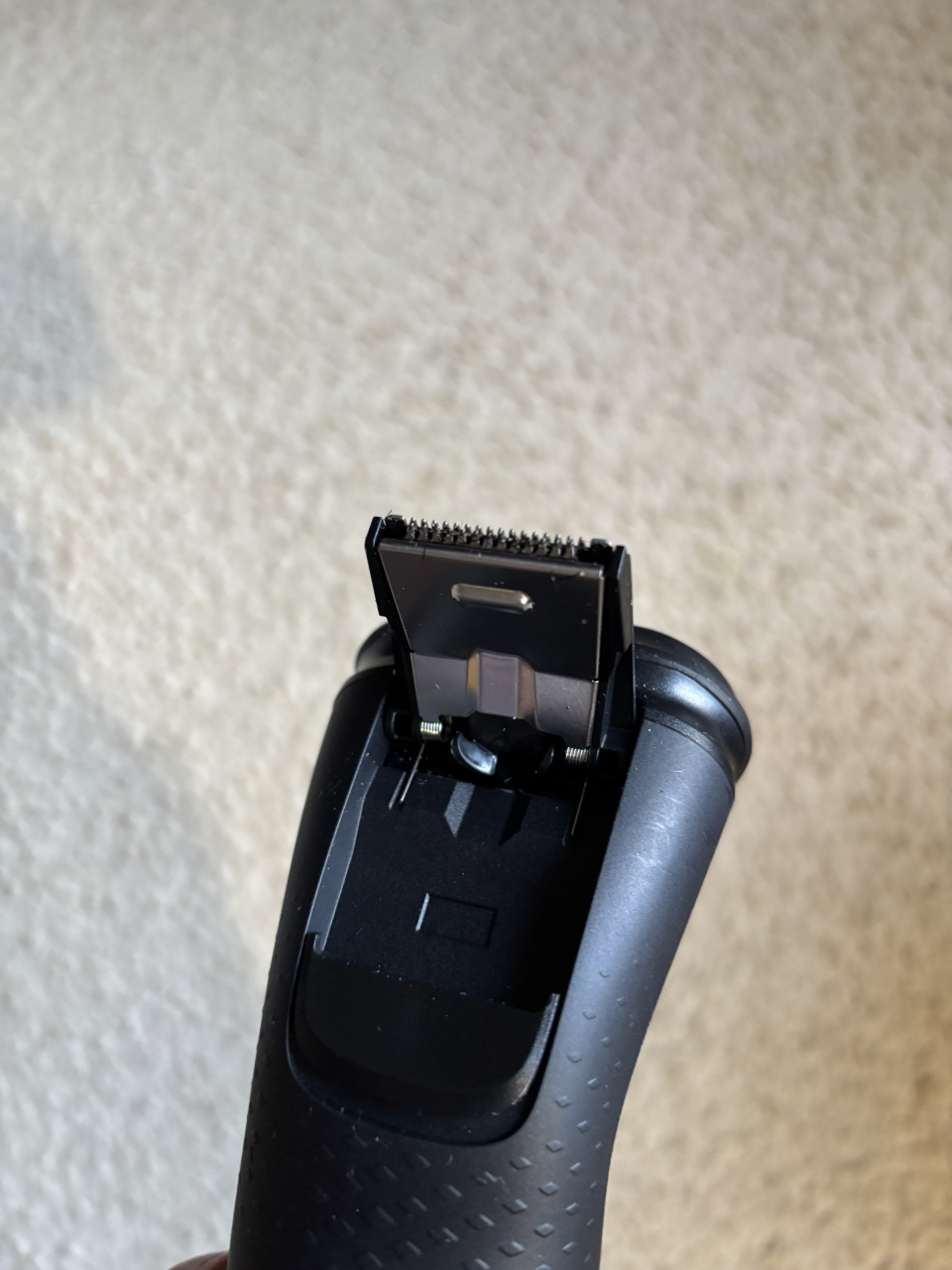 色が違うだけで、基本的な形は変わっていません。つまり機構も殆ど同じです。但し、次の画像のように上の写真の裏側に「ポップアップトリマー」という「際(きわ)ぞり」の機構が追加されていることがちょっとした進歩です。もみ上げを揃えるのに重宝しています。他のメーカーでは大分前からこの機構は付いているものがありましたが・・・。