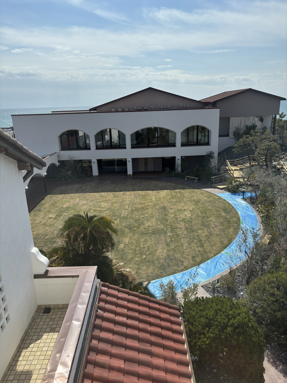 塔屋の南側 芝生の中庭を挟み結婚式場、その先は駿河湾です